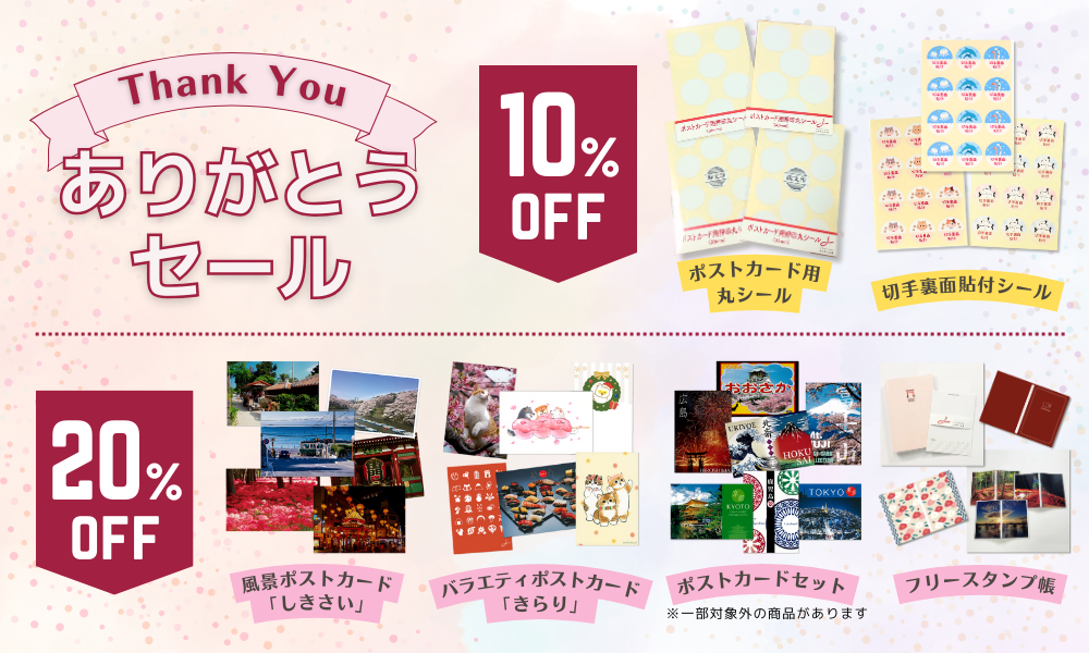 平素より「うつろい工房」をご愛顧いただき、誠にありがとうございます。 閉鎖までの時間が迫る中、感謝の気持ちを込めて「ありがとうセール」第二弾を追加開始いたします。第二弾は、「ポストカード用押印丸シール」「切手裏面貼付シール」を10%割引にて販売いたします。